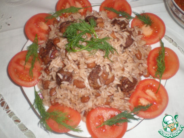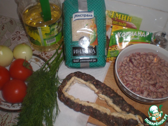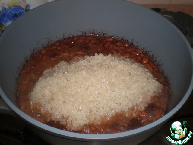 Теперь очередь риса. Промытый рис добавляем к фасоли и колбасе. Добавляем приправы, тмин и кориандр не жалеть. Заливаем горячей водой, чтобы рис был покрыт, примерно, на 1 см.