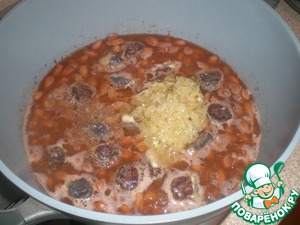 Варим фасоль в 5 стаканах воды. Обжариваем лук до золотистого цвета. К готовой фасоли добавляем мелко нарезанную колбасу и обжаренный лук. Если необходимо, то доливаем немного горячей воды.
