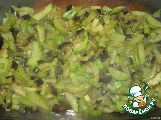 Кабачки и баклажаны нарезать брусочками и обжарить на растительном масле, посолить. Выложить в огнеупорную форму.