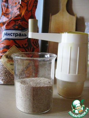 Смолоть 1 стакан гречневой крупы любым удобным способом. Можно не в муку. Просеивать не нужно. У нас получилось 1/2 стакана молотой гречки.