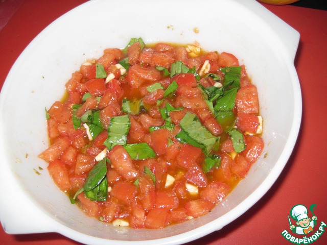 Чеснок и базилик соединить с помидорами, посолить, поперчить, добавить оливковое масло, уксус, лим. сок, орегано. Все перемешать.