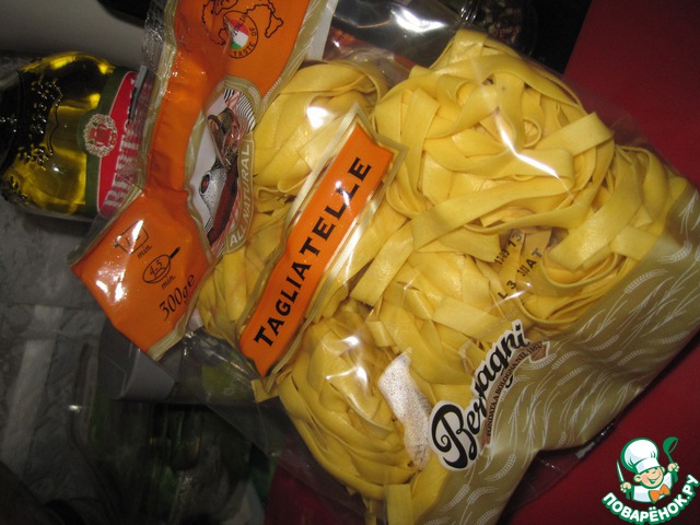 Тем временем ставим воду для нашей пасты. Как закипит, добавить соль и немного оливкового масла. Отвариваем наши спагетти/тальятелле до состояния альденте (мои-магазинные варились 2-3 минутки).