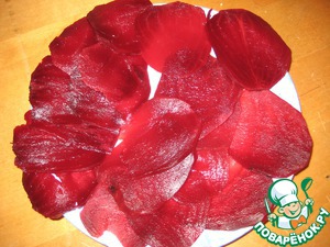 • После того, как свекла полностью сварится, остудить, почистить и нарезать очень-очень тонкими кружками (если нарезать толстыми, они не будут держаться). Часть кусочков (не кондицию) отложить для начинки и салата.