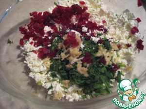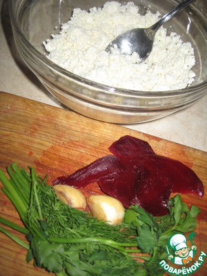 • Для начинки возьмем творог, зелень, чеснок и несколько кусочков свеклы (в оригинальном рецепте предлагают в начинку и салат добавлять ботву, но сейчас зима, и ботву достать я не сумела).