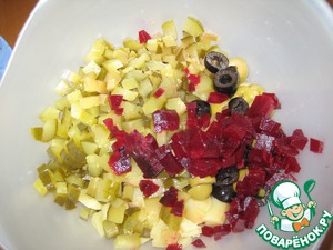• Готовим салат: картофель очистить, нарезать кубиками. К ним добавить нарезанные кубиками огурцы. Маслины (у меня и оливки и маслины) нарезаем кружочками, добавляем к картофелю. Оставшуюся свеклу нарезаем кубиками и добавляем в салат. Перемешиваем все, заправляем солью, перцем, растительным маслом.