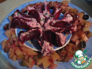 Мой муж очень любит тертую свеклу с чесноком. Это блюдо - как одна из вариаций на эту тему. По мотивам рецепта из "Школа гастронома" №18 за сентябрь 2009 г.