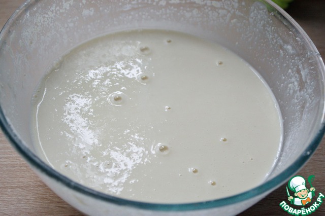 Затем вливайте воду, непрерывно помешивая. Воды может уйти чуть больше, смотрите по тесту: оно должно быть такой густоты, как на обычные тонкие блины.