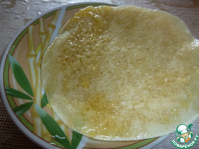 Сняли блинчик смазали соусом с двух сторон. Вот такой он снизу и сверху.