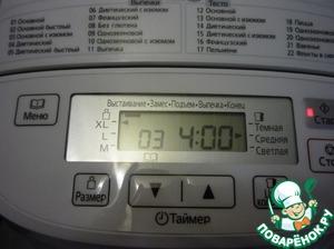 Выбираем программу "Основная с изюмом". В вашей хлебопечке может быть другое название. Корочка -"средняя", вес -XL (1000-1100г)