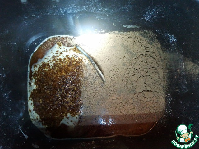 Заливаем пиво в чашу хлебопечи. Добавляем йогурт, соль, мед (или сахар), растворимый кофе, какао-порошок, растительное масло, яблочный уксус.