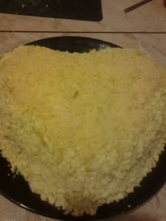 Яйца разделить на белки и желтки. Белки натереть на мелкой терке, желтки мелко растереть. Сыр натереть. Начинаем выкладывать салат слоями в виде сердца. Все слои промазываем майонезом.