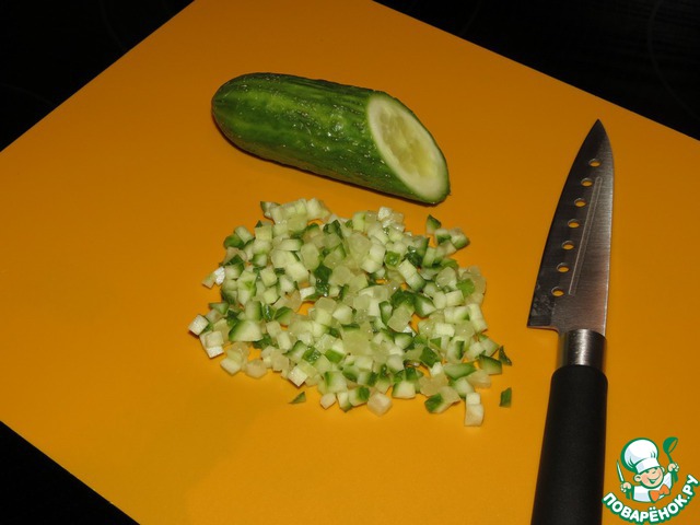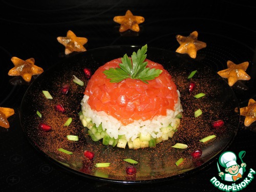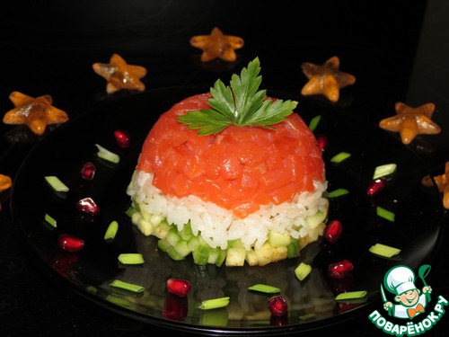Собираем салат слоями, первый слой - лосось, второй - рис, третий - огурец. Перевернуть форму на блюдо и снять ее.