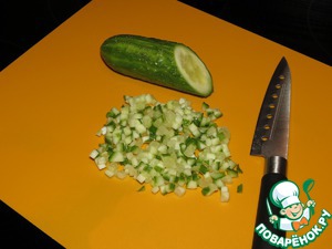 Огурец режем маленькими кубиками.