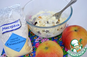 Творог смешать с изюмом, семолиной и яйцом и оставить постоять минут 15.