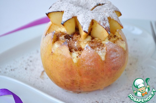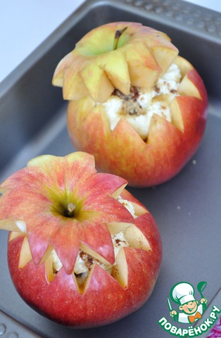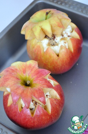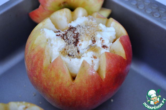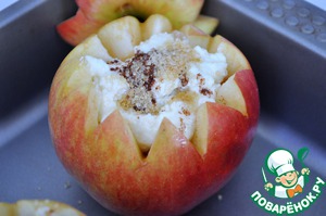 Заполнить яблоки творогом с сeмолиной, присыпать 0,5 ч. л. коричневого сахара и корицей.