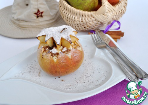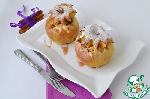 Выложить на лист, на дно налить немного воды, чтобы не пригорало. Ставлю в духовку на 15 минут при 180 градусах. Готовые яблоки вынуть, присыпать сахарной пудрой с корицей.