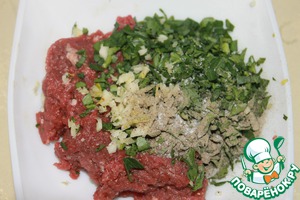 Петрушку мелко рубим с чесноком, и вмешиваем в фарш вместе с перцем и солью (с солью будьте аккуратнее, ведь у нас будет начинка из голубого сыра, а он достаточно соленый