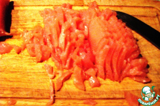 Следом отправляется нарезанный четверть кольцами репчатый лук.