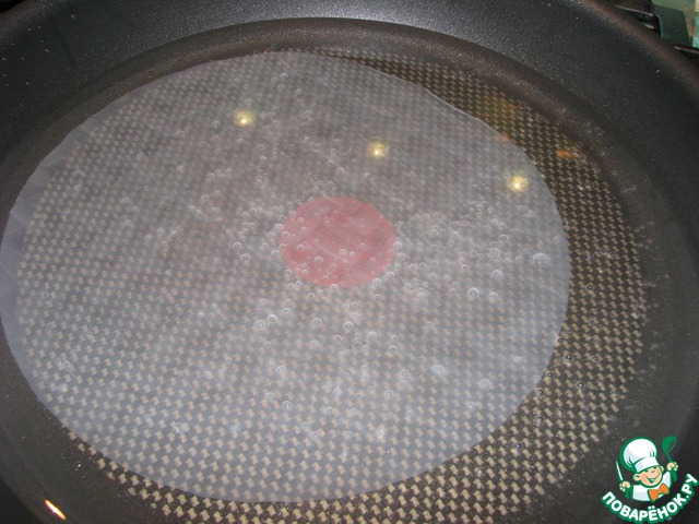 Обжариваем на большом количестве растительного масла буквально по 30 секунд с каждой стороны, иначе бумага становится "резиновой".