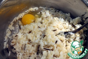 • Готовый рис перемешиваем с яйцом