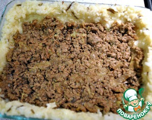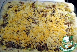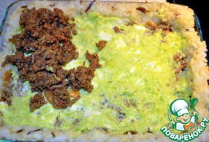 • Следующий слой это сырно-луковый и опять фарш