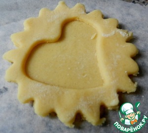 Далее занимаемся тестом. Отщипнуть небольшой кусочек, раскатать и выдавить печенье. Я делала два солнышка, в одном выдавливала сердечко.