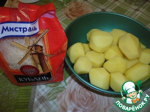 А в это время картошку почистить, залить водой, добавить соль и поставить на огонь. Варить до готовности картофеля. Рис промыть, залить большим количеством воды, добавить соль и поставить варить. Как вода закипит, варить рис 10 минут.