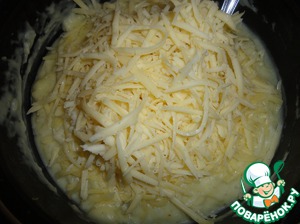 Сыр натираем на крупной тёрке и добавляем в начинку. Ещё раз всё хорошо перемешиваем. Начинка готова. Включаем духовку на 180град.
