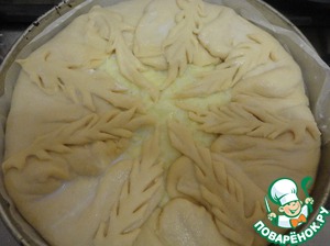 Края завернуть на начинку. При желании сделать украшение из теста. Смазать свежим желтком или молоком. Я люблю молоком.