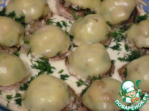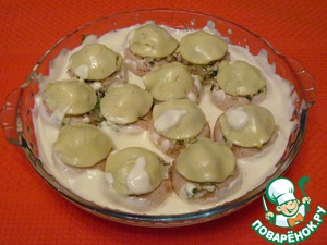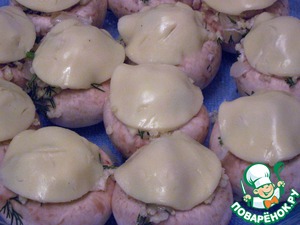 Положить шляпки грибов в смазанную маслом форму. Наполнить их начинкой.