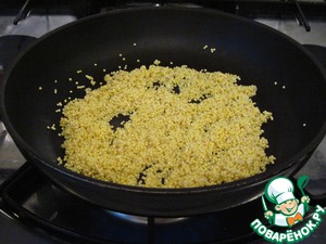 Обжарить крупу на сухой разогретой сковороде в течении 4 минут.