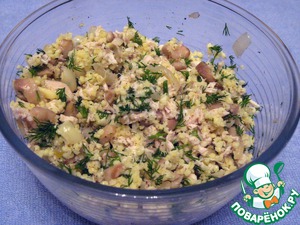 Отварное куриное мясо нарезать маленькими кубиками. Обрезки от сыра измельчить, перемешать с крупой, куриным мясом, измельченной зеленью укропа, обжаренными луком и грибами. Поперчить, посолить. Тщательно перемешать.