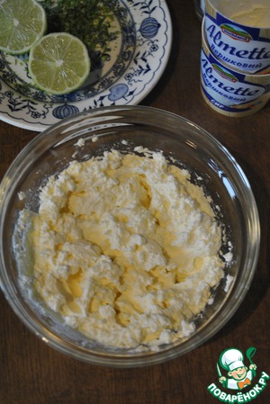 Миксером взбиваем сыр сливочный с сах. пудрой, соком и цедрой лайма. Добавить 100 г маскарпоне, но у меня не было, поэтому я ограничилась сливочным сыром).