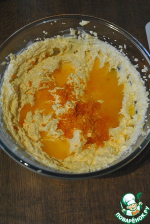 2. перелить взбитые с сахаром желтки(там же 1 целое яйцо) в миску, в которой будет смешиваться тесто, аккрутано вмешать (порциями) всю муку, потом добавить туда специи, масло, морковь, алкоголь