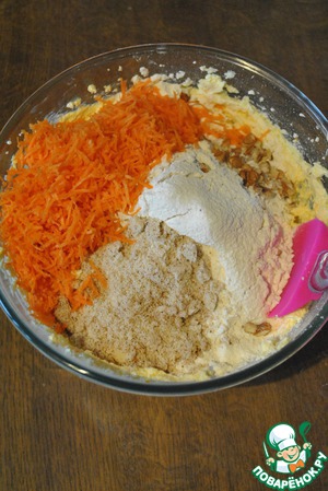Всыпьте просеянную муку, разрыхлитель, миндаль молотый, орехи, пряности и морковь. Хорошенько перемешайте. Тесто получается густым.