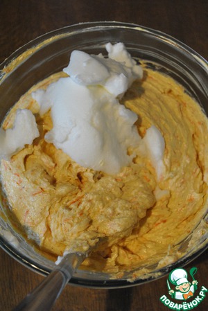 В отдельной миске взбейте белки со щепоткой соли в плотную пену и аккуратно вмешайте их в тесто.