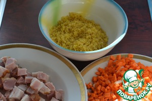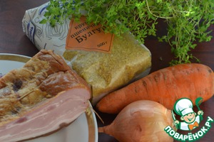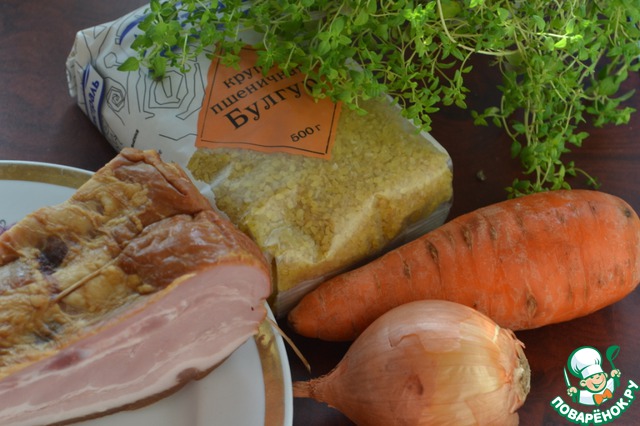 Для приготовления нам потребуется Булгур, Морковь, Луковица, Грудинка, Тимьян (дополнительно по вкусу соль, перец и раст. масло для обжарки).