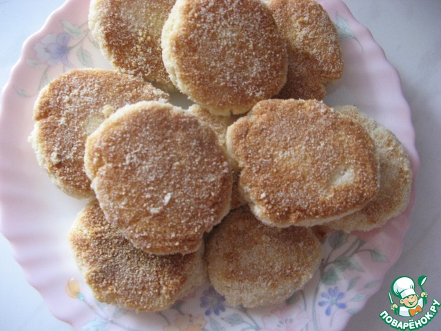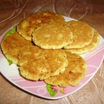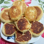 Сначала, после 100 мл молока, тесто показалось жидким — добавила крупы, а когда тесто стало как на фото, оставила на незнамо сколько времени (засмотрелась сериалом). Обжаривала, сформировав лепешки следующим образом: от шара теста отрывала кусочек с грецкий орех, формировала шарик меж ладоней и пальцами придавала плоскую форму. В итоге не развалилась ни одна лепешечка.