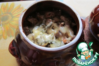 2. Положить в горшочек все в таком порядке: мясо, морковь, грибы.