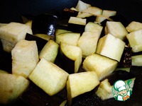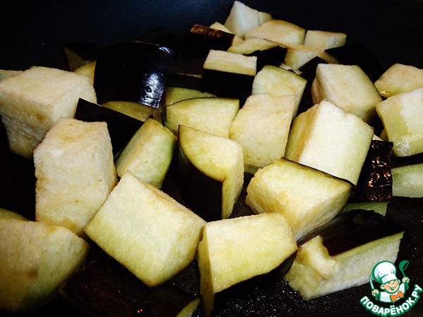 Баклажан нарезать квадратными кусочками, обжарить на оливковом масле около 7 мин. |
