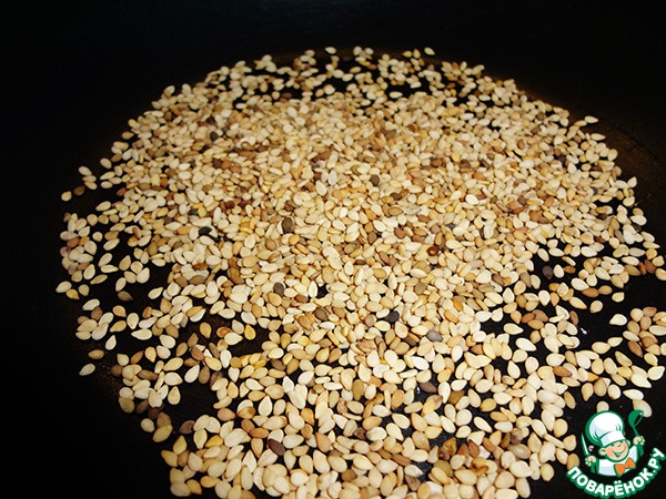 Если кунжут сырой, обжарить его на сухой сковородке несколько минут до золотистого цвета. Лук нарезать полукольцами, добавить к баклажанам и обжарить вместе около 5 мин. |