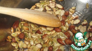 • Мелко порубить орехи и семечки тыквы, затем обжарить их в растительном масле до золотистого цвета. Добавить специи (я клала по щепотке мускатного ореха и красного перца). Смешать с рисом, закрыть крышкой и дать постоять 3-5 минут.