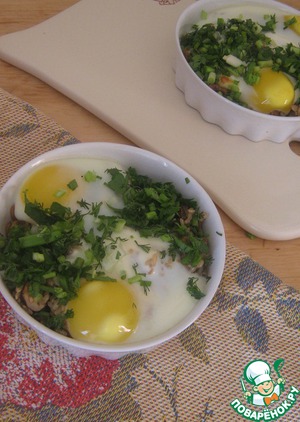 • Разложить рис по порционным формам. Добавить сметану и нарубленную кубиками моцареллу. Аккуратно разбить по два яйца в каждую формочку. Поместить формочки на противень или в большую форму для запекания, налить горячей воды примерно до половины. Поставить в разогретую духовку. Запекать при 180С до готовности. Готовое блюдо посыпать мелко накрошенной зеленью.