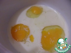 Три яйца разбиваем, добавляем к ним растительное масло, молоко и соль. Венчиком взбиваем до однородности, миллионы пузырьков нам не нужны.