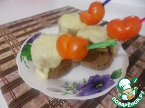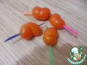 Для украшения, тем временем, моем помидорки и разрезаем их по диагонали, затем попарно надеваем на шпажку, дабы получилось нечто отдаленно напоминающее сердечко. Вообще для этих целей больше подходят более продолговатые черри, но у нас в магазинах почему-то все округлые.