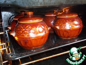 Закрыть горшки крышками. Поставить в холодную духовку. Температуру выставить 220-230 градусов. Тушить мясо примерно 60-75 мин.