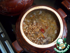 Рецепт «Гречка с мясом и шкварками в горшочке»: