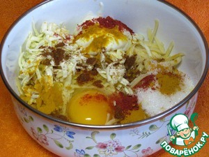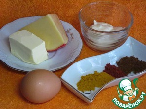 Cмешаем размягченное масло с натертым на крупной терке сыром, яйцом, сметаной, сахаром, мукой и пряностями.