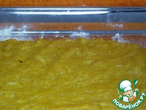 По истечении времени, посыпем поднос мукой, раскатаем тесто в пласт толщиной около 1 см.