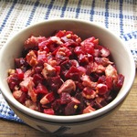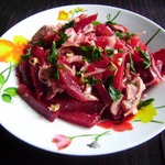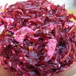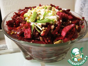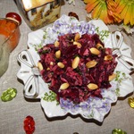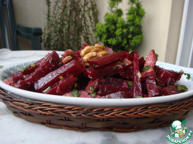 Простой, полезный и сытный салат с быстро маринованной свеклой, орешками и любым имеющимся готовым мясом. У нас остался кусочек готовой индейки, вот с ним и сложился салатик, нам понравился, и я решила поделиться, может, кому сгодится для разнообразия)